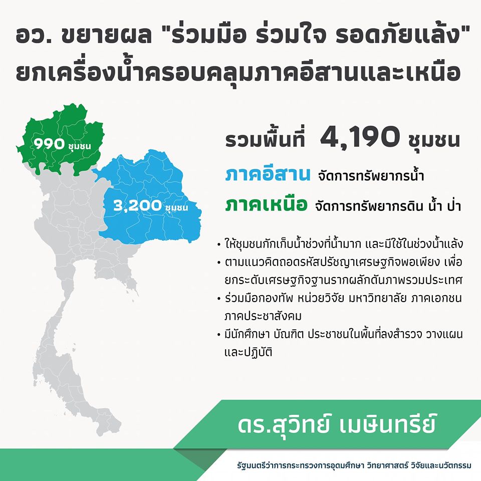 จากที่กระทรวงการอุดมศึกษา วิทยาศาสตร์ วิจัยและนวัตกรรม (อว.) โดยสถาบันสารสนเทศทรัพยากรน้ำ (องค์การมหาชน) หรือ สสน. ร่วมกับ มูลนิธิอุทกพัฒน์ ในพระบรมราชูปถัมภ์ เอสซีจี มูลนิธิบัวหลวง และธนาคารกรุงเทพ จำกัด (มหาชน) และสภาเกษตรกรแห่งชาติ ได้แถลงผลถึงความสำเร็จในโครงการ ‘ร่วมมือ ร่วมใจ รอดภัยแล้ง’ ที่เป็นการทำงานบูรณาการทุกภาคส่วนออกมาให้เห็นในเชิงประจักษ์ เป็นการผนึกกำลังกันระหว่าง รัฐ เอกชน ประชาสังคม โดยใช้กลไกที่มุ่งสู่การพัฒนาที่ยั่งยืนอย่างแท้จริง และเป็นตัวอย่างของการถอดรหัสปรัชญาเศรษฐกิจพอเพียงออกมาได้อย่างน่าชื่นชม