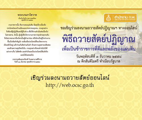 ขอเชิญชวนทุกท่าน ร่วมเป็นส่วนหนึ่งในการถวายสัตย์ปฏิญาณตน เพื่อถวายแด่องค์ในหลวงของเรา ในกิจกรรมพิธีถวายสัตย์ปฏิญาณ ท่านสามารถเข้าร่วมกิจกรรมได้ที่ ถวายสัตย์ปฏิญาณ