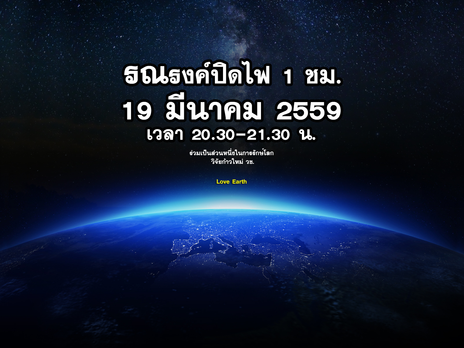 ร่วมกิจกรรมปิดไฟ 1 ชั่วโมงเพื่อลดโลกร้อนอย่างต่อเนื่อง ในปีนี้กำหนดจัดขึ้นในวันเสาร์ที่ 19 มีนาคม 2559 เวลา 1 ชั่วโมง