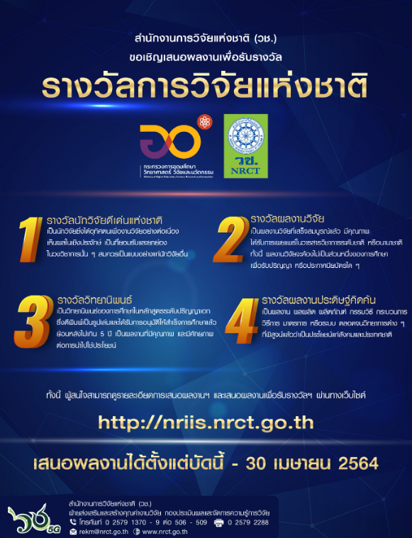 ขอเชิญเสนอผลงานเพื่อขอรับรางวัลการวิจัยแห่งชาติ ประจำปีงบประมาณ 2565 ตั้งแต่บัดนี้ – 30 เมษายน 2564