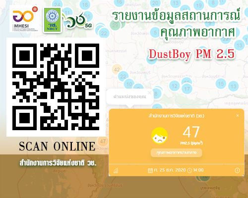 ระบบคอยตรวจสอบสภาพอากาศของฝุ่นละอองที่มีประสิทธิภาพ ค้นหาจุดข้อมูลความร้อน การคาดการในคุณภาพทางอากาศ โดยท่านสามารถเข้าไปตรวจสอบดูข้อมูลได้ที่ https://pm2_5.nrct.go.th/map/map1h